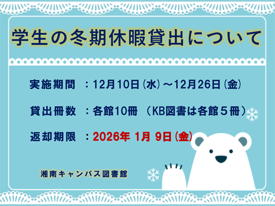 学生を対象として、冬期休暇貸出を以下のとおり、実施します。