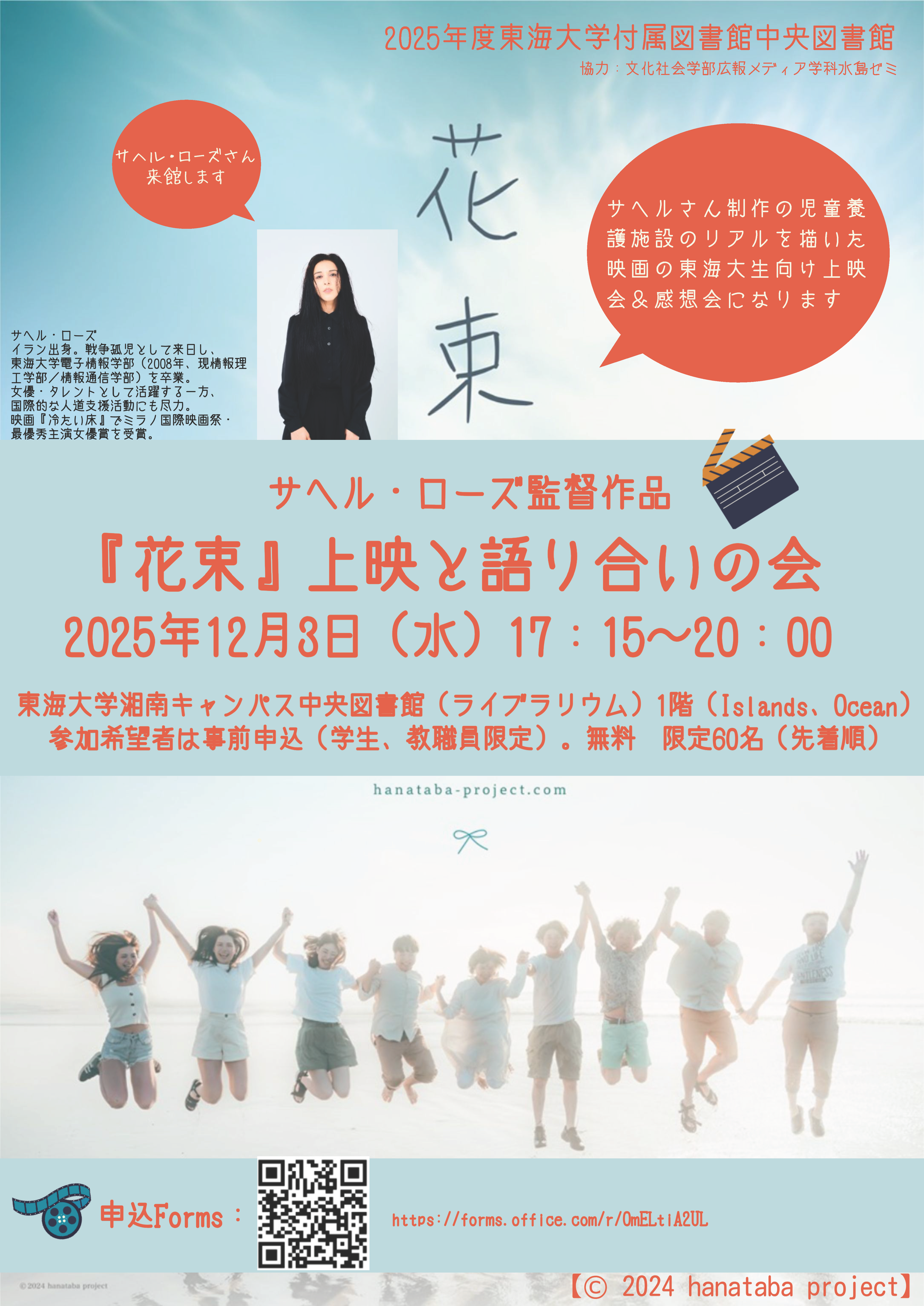 『花束』は「児童養護施設出身の若者8人が自らの実体験を語りながら役者としても演技する、ノンフィクションと劇映画を融合させた実験的映画」(毎日新聞2024年12月5日)です。サヘル・ローズ氏がパーソナリティを務めていたラジオ番組「SDGs学部ミライコード」(TOKYOFM)に水島久光付属図書館長が出演したことをきっかけに交流をもち、2024年10月都内の上映会に参加。新しくできた図書館で、ぜひ本学の学生たちに観て語ってほしいと相談、温めてきた企画です。複雑な社会課題と交錯するテーマ、さまざまな表現的試みが盛り込まれたこの作品をぜひ一緒に体験し、私たちにとって大切なものとは何かをともに考えたいと思います。奮ってご参加ください。