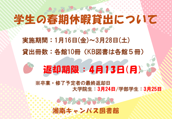 ※卒業・修了予定者の最終返却日 大学院生:3月24日/学部学生:3月25日