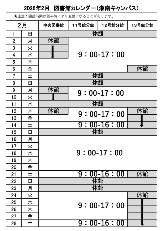 入試実施に伴い、2月の開館スケジュールは下記の通りとなります。